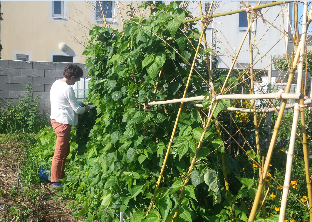 Pour pouvoir resemer l'année prochaine, les délicieux haricots verts grimpants au nom inconnu, les 4 dernières rames garderont leurs gousses pour en récupérer les graines. Elles sont signalées par du tissu coloré.