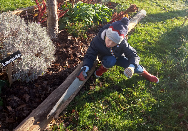 Essai de bordures avec des 1/4 de troncs de châtaignier.