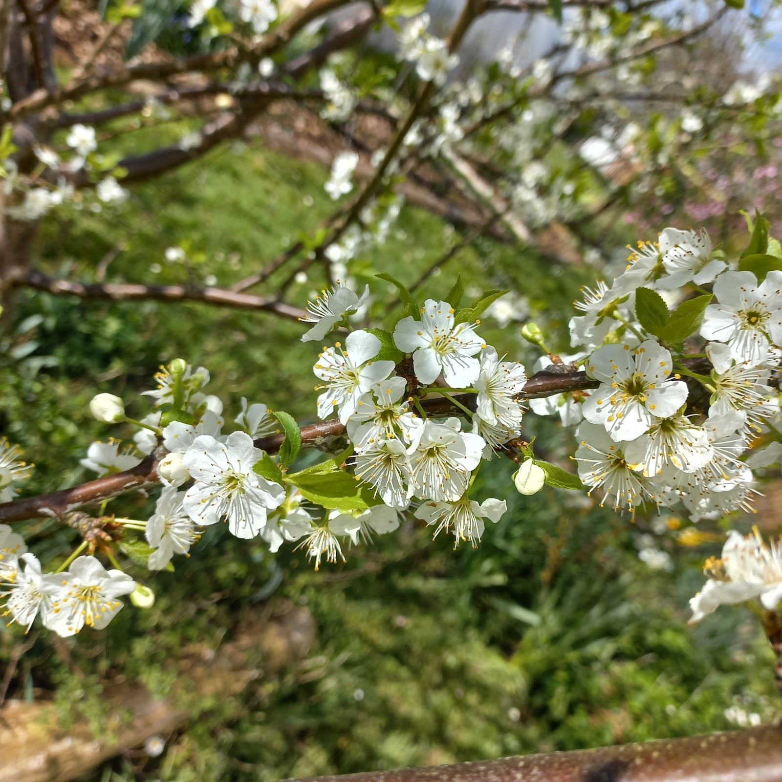 Et, après le tour du Jardin avec Martine, la pause photo de Paloma, Alexia et Raphaël à côté d'un pêcher en fleurs...